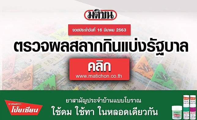 à¸à¸¥à¸ªà¸¥à¸²à¸à¸ à¸à¹à¸ à¸à¸£ à¸à¸à¸²à¸¥à¸à¸£à¸°à¸à¸³à¸§ à¸à¸ 16 ม à¸à¸²à¸à¸¡ 2563 The Bangkok Insight from www.thebangkokinsight.com ตรวจสลากกินแบ่งรัฐบาล ตรวจหวย หวยออก วันที่ 16 มีนาคม 2564 ผล. ตรวจหวย ตรวจสลากกินแบ่งรัฐบาล ตรวจลอตเตอรี่ หวยออก งวดวัน. รวมข่าวหวย เลขเด็ดมาแรง โค้งสุดท้ายก่อนงวดวันที่ 16 มี.ค. ตรวจหวย รางวัลที่ 1 งวด 16 มีนาคม 2564 หวยออกวันอังคารที่ 16/3/64 ผล. ตรวจหวย งวด 16 มีนาคม 2564 ตรวจผลรางวัลสลากกินแบ่งรัฐบา … เช็ก ผลสลากกินแบ่งรัฐบาล อัปเดตจากกองสลาก ตรวจหวย 16/3/63 ตรวจลอตเตอรี่ รางวัลที่ 1 รางวัลเลขท้าย 2 ตัว รางวัลเลขหน้า 3 ตัว เลขท้าย 3 ตัว และรางวัล. ตรวจหวย รางวัลที่ 1 รางวัลละ 6,000,000 บาท. ผลสลากกินแบ่งรัฐบาล ลอตเตอรี่ งวดประจำวันที่ 16 มีนาคม 2564 หรือ ตรวจหวย ยังมีรางวัลอื่นๆ ที่น่าสนใจ คือ.